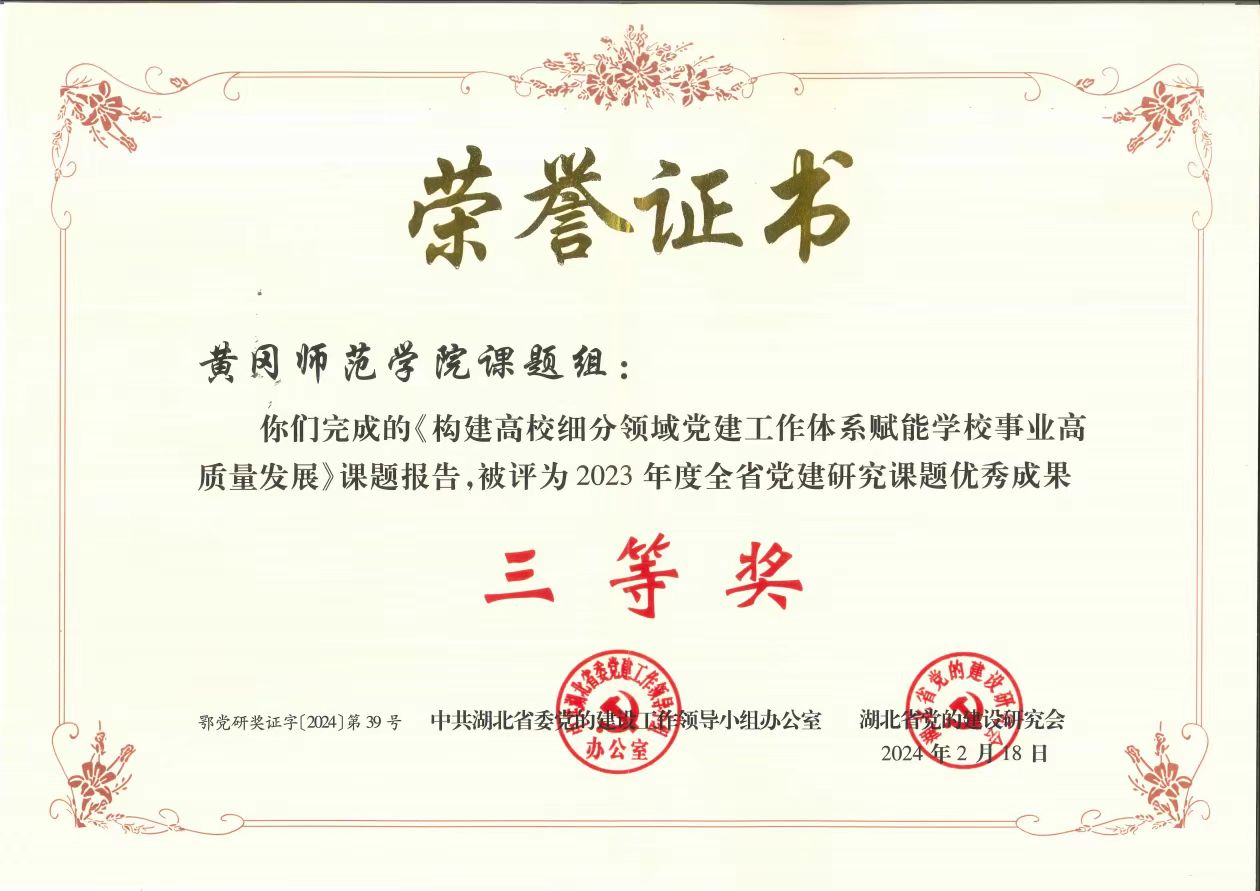 本网讯 近日,中共湖北省委党的建设工作领导小组办公室、湖北省党的建设研究会印发《关于表彰2023年度全省党建研究课题优秀成果的通报》,我校主持的研究课题《构建高校细分领域党建工作体系赋能学校事业高质量发展》荣获三等奖。