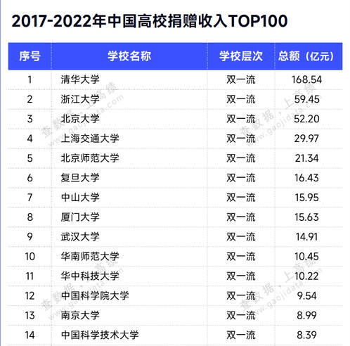 “2017-2022年中国高校捐赠收入TOP100榜单”是高绩根据基金会中心网(CFC)和慈善中国官方发布的最新数据,对“双一流”建设以来中国内地高校6年(2017年-2022年)社会捐赠总收入进行的统计排名,社会影响广泛,进一步提升了学校的知名度和美誉度。