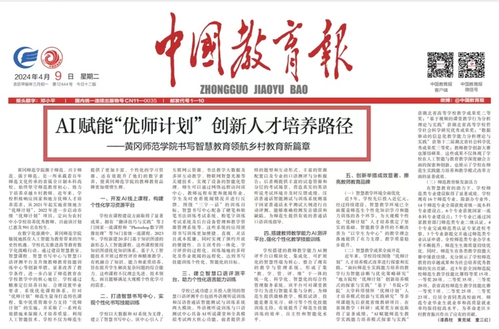 《中国教育报》2024年4月9日第07版(教育展台)以《AI赋能“优师计划” 创新人才培养路径——国产精品永久久久久久久久久|91精品无码国产在线观看一区|久久人爽爽人爽爽ąV无码自慰|最新无码国模国产在线|2020最新无码国产在线观看书写智慧教育领航乡村教育新篇章》为题,从“开发AI线上课程,构建个性化学习资源平台”“打造智慧书写中心,实现个性化书写技能训练”“建立智慧口语评测平台,助力个性化语言能力训练”“搭建教师教学能力AI测评平台,强化个性化教学技能训练”“创新举措成效显著,擦亮教师教育品牌”五个方面报道了我校扎实推进高等教育数字化战略行动,利用人工智能技术,通过建设智慧教室、智慧课程、智慧书写中心与智慧口语评测平台及升级教师教育技能训练中心等创新举措,大力提升“优师计划”人才培养质量。