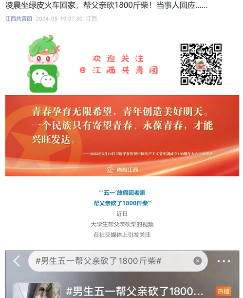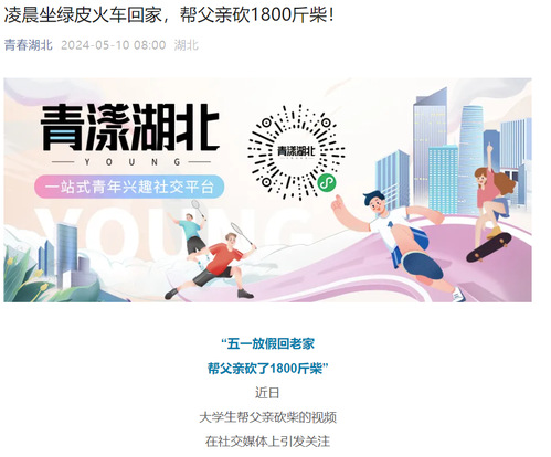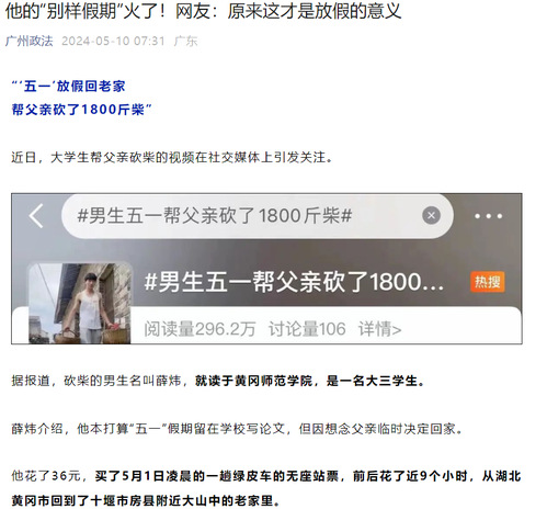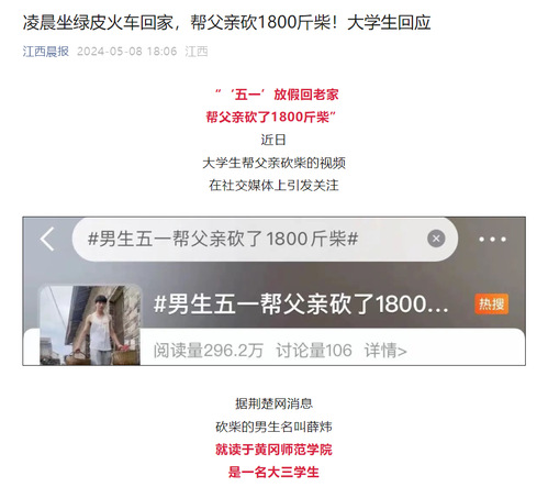 近日,我校体育学院大三学生薛炜五一回老家帮父亲砍了1800斤柴的故事在社交媒体上受到热烈关注和讨论,人民日报、半月谈、中国青年报、腾讯新闻、极目新闻、湖南教育电视台、荆楚网等多家主流媒体纷纷进行了报道,共青团中央学校部、湖北省教育厅、江西共青团、广州政法等多家单位在官方平台予以推介。