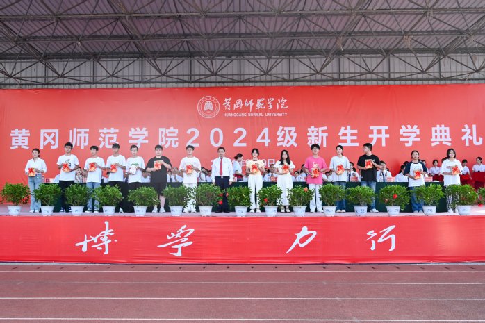 陈向军为在开学典礼日过生日的新生赠书,借此希望同学们奋力拼搏,刻苦学习,努力钻研,争做堪当民族复兴大任的时代新人。全体校领导为新生代表佩戴校徽,以此勉励同学们铭记“厚德、博学、力行、致远”校训,展现黄师学子的责任与担当。