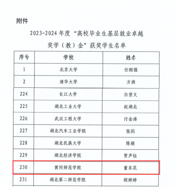 “高校毕业生基层就业卓越奖学(教)金”由教育部高校学生司、教育部学生服务与素质发展中心共同指导,中国教育发展基金会设立,旨在奖励赴基层就业并做出突出业绩的普通高校毕业生和普通高校指导服务大学生赴基层就业工作有突出贡献的教师。全国共398名毕业生,其中湖北省18人获奖。