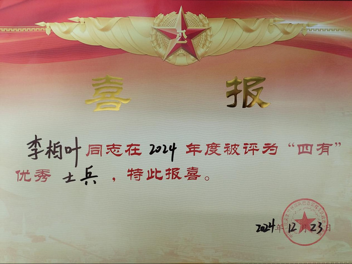 2024年3月,李柏叶同学应征入伍。在部队服役期间,他刻苦训练、顽强拼搏、勤奋实干,始终以冲锋姿态练就过硬本领、主动担当作为,出色完成各项训练任务。