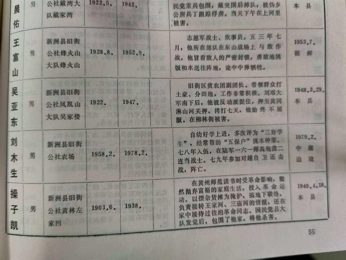 操子凯,1901年出生于湖北新洲,1938年牺牲。关于他的信息,只在中华英烈网和湖北省革命烈士英名录上留下短短的几行:“1935年参加革命,在黄州师范读书时受革命影响,毅然抛弃富裕的家庭生活,投入革命运动。以摆杂货摊为掩护,搞地下联络,负责接转王家河、三庙河的情报,还在家中接待过往的革命同志。国民党县大队发觉后,包围了他家,将他杀害。”